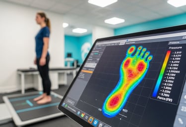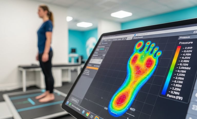 Avaliação biomecânica digital da pisada, identificando pontos de apoio, desequilíbrios e padrões de movimento que orientam o projeto técnico da palmilha sob medida.